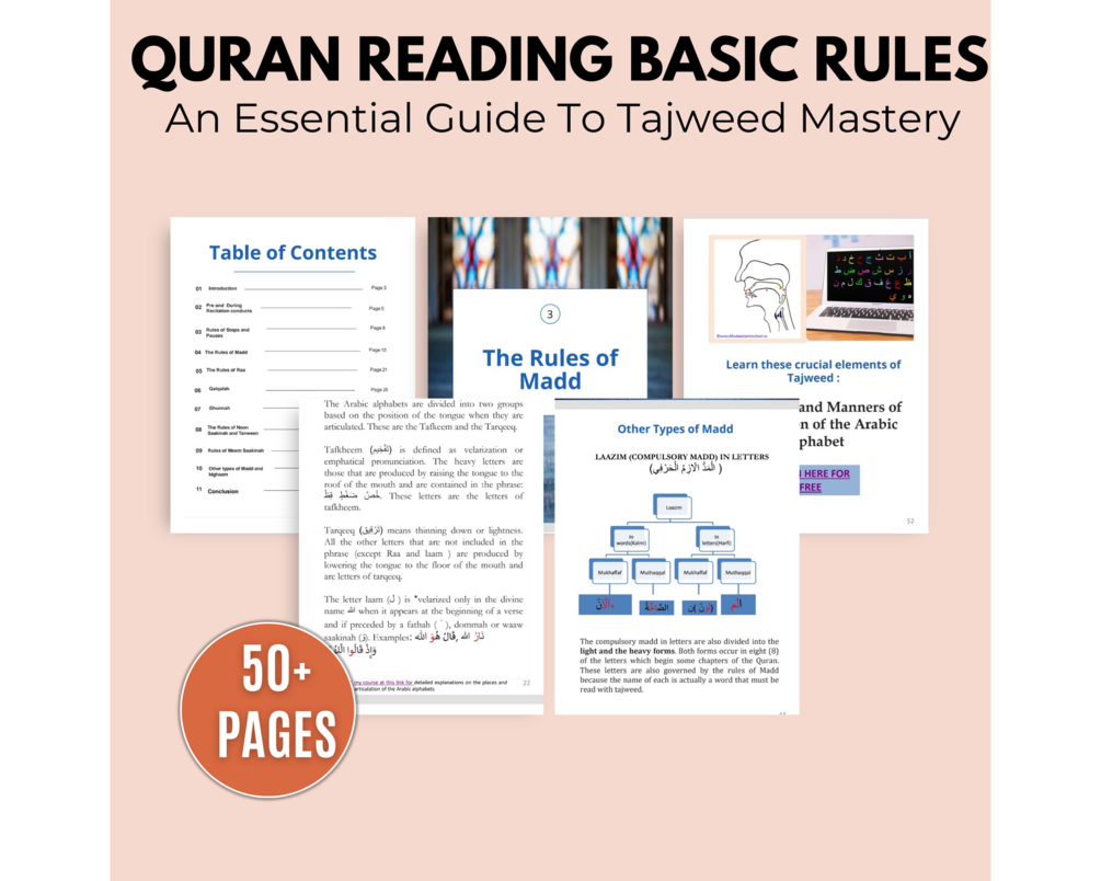 Welcome to the ultimate guide for mastering Tajweed! Our comprehensive ebook, "Quran Reading Basic Rules" is a comprehensive guide to Quranic recitation. It is designed for English-speaking learners at all levels who are dedicated to perfecting their recitation of the Holy Quran.